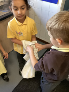 We watched a video that explained the story of Jesus washing his friend’s feet and how he served the community around him. We washed our friend’s hands and then thought of ways that we could ‘serve’ at home or at school. We drew all of our ideas.